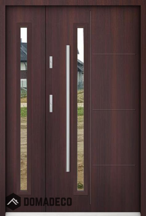 The door is made of stainless steel. Inside it is filled with PUR polyurethane foam and wood. The thickness of the door slab is 2.2 inch. Dual sealing system - one seal is in the dap of the frame and the other is located in the supporting part of the door slab. They reduce vibration and protect your house from losing the heat. They don't change their volume under the influence of atmospheric conditions. The door frame has anti-burglar reinforcements in hinge parts and locking points.