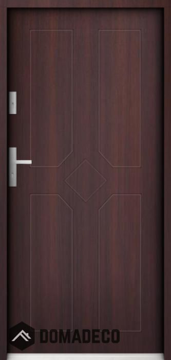 The door is made of stainless steel. Inside it is filled with PUR polyurethane foam and wood. The thickness of the door slab is 2.2 inch. Dual sealing system - one seal is in the dap of the frame and the other is located in the supporting part of the door slab. They reduce vibration and protect your house from losing the heat. They don't change their volume under the influence of atmospheric conditions. The door frame has anti-burglar reinforcements in hinge parts and locking points.
