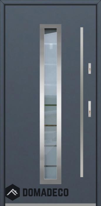 The door is made of stainless steel. Inside it is filled with PUR polyurethane foam and wood. The thickness of the door slab is 2.5 inch. Dual sealing system - one seal is in the dap of the frame and the other is located in the supporting part of the door slab. They reduce vibration and protect your house from losing the heat. They don't change their volume under the influence of atmospheric conditions. The door frame has anti-burglar reinforcements in hinge parts and locking points.
