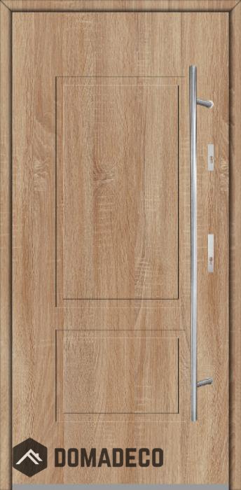 The door is made of stainless steel. Inside it is filled with PUR polyurethane foam and wood. The thickness of the door slab is 2.5 inch. Dual sealing system - one seal is in the dap of the frame and the other is located in the supporting part of the door slab. They reduce vibration and protect your house from losing the heat. They don't change their volume under the influence of atmospheric conditions. The door frame has anti-burglar reinforcements in hinge parts and locking points.