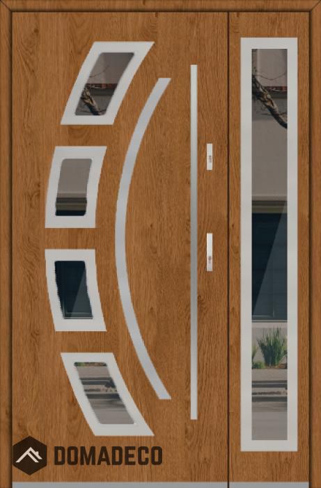 The door is made of stainless steel. Inside it is filled with PUR polyurethane foam and wood. The thickness of the door slab is 2.1 inch. Dual sealing system - one seal is in the dap of the frame and the other is located in the supporting part of the door slab. They reduce vibration and protect your house from losing the heat. They don't change their volume under the influence of atmospheric conditions. The door frame has anti-burglar reinforcements in hinge parts and locking points.