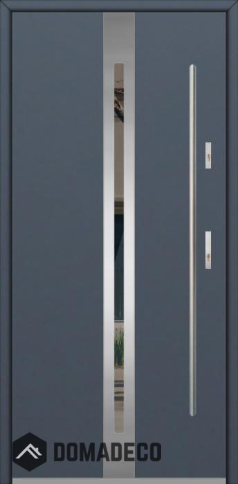 The door is made of stainless steel. Inside it is filled with PUR polyurethane foam and wood. The thickness of the door slab is 2.5 inch. Dual sealing system - one seal is in the dap of the frame and the other is located in the supporting part of the door slab. They reduce vibration and protect your house from losing the heat. They don't change their volume under the influence of atmospheric conditions. The door frame has anti-burglar reinforcements in hinge parts and locking points.