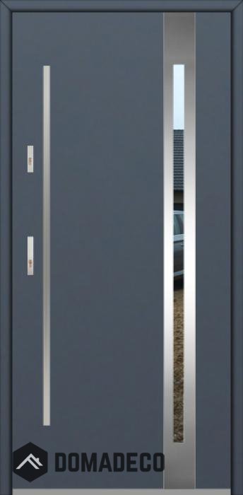 The door is made of stainless steel. Inside it is filled with PUR polyurethane foam and wood. The thickness of the door slab is 2.5 inch. Dual sealing system - one seal is in the dap of the frame and the other is located in the supporting part of the door slab. They reduce vibration and protect your house from losing the heat. They don't change their volume under the influence of atmospheric conditions. The door frame has anti-burglar reinforcements in hinge parts and locking points.