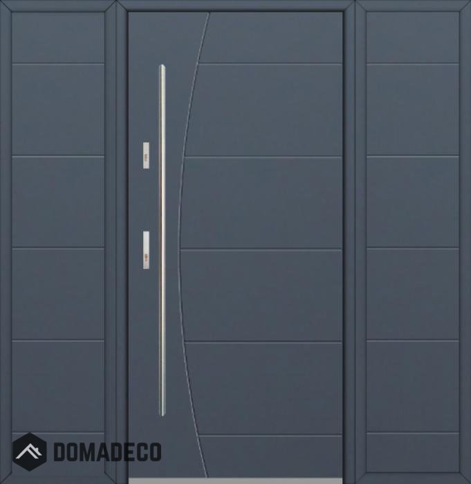 The door is made of stainless steel. Inside it is filled with PUR polyurethane foam and wood. The thickness of the door slab is 2.1 inch. Dual sealing system - one seal is in the dap of the frame and the other is located in the supporting part of the door slab. They reduce vibration and protect your house from losing the heat. They don't change their volume under the influence of atmospheric conditions. The door frame has anti-burglar reinforcements in hinge parts and locking points.