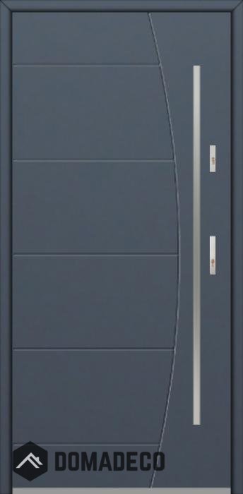 The door is made of stainless steel. Inside it is filled with PUR polyurethane foam and wood. The thickness of the door slab is 2.5 inch. Dual sealing system - one seal is in the dap of the frame and the other is located in the supporting part of the door slab. They reduce vibration and protect your house from losing the heat. They don't change their volume under the influence of atmospheric conditions. The door frame has anti-burglar reinforcements in hinge parts and locking points.