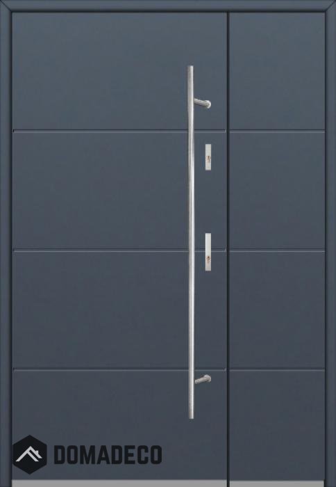 The door is made of stainless steel. Inside it is filled with PUR polyurethane foam and wood. The thickness of the door slab is 2.1 inch. Dual sealing system - one seal is in the dap of the frame and the other is located in the supporting part of the door slab. They reduce vibration and protect your house from losing the heat. They don't change their volume under the influence of atmospheric conditions. The door frame has anti-burglar reinforcements in hinge parts and locking points.
