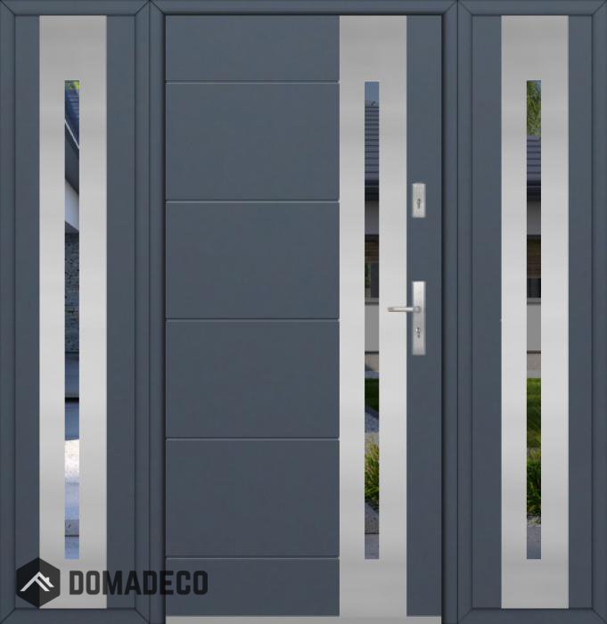 The door is made of stainless steel. Inside it is filled with PUR polyurethane foam and wood. The thickness of the door slab is 2.1 inch. Dual sealing system - one seal is in the dap of the frame and the other is located in the supporting part of the door slab. They reduce vibration and protect your house from losing the heat. They don't change their volume under the influence of atmospheric conditions. The door frame has anti-burglar reinforcements in hinge parts and locking points.