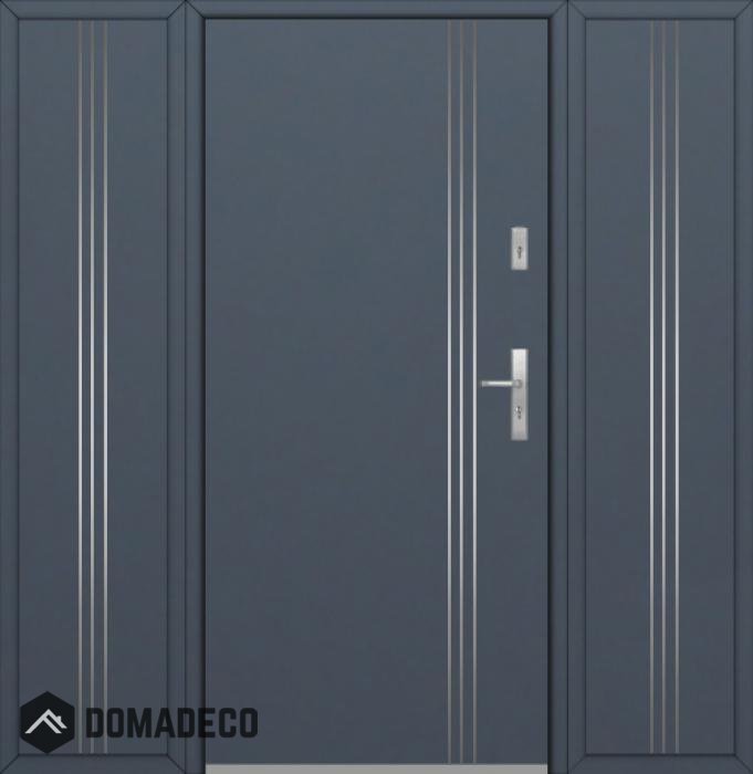 The door is made of stainless steel. Inside it is filled with PUR polyurethane foam and wood. The thickness of the door slab is 2.1 inch. Dual sealing system - one seal is in the dap of the frame and the other is located in the supporting part of the door slab. They reduce vibration and protect your house from losing the heat. They don't change their volume under the influence of atmospheric conditions. The door frame has anti-burglar reinforcements in hinge parts and locking points.