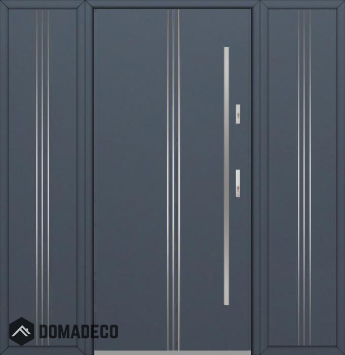 The door is made of stainless steel. Inside it is filled with PUR polyurethane foam and wood. The thickness of the door slab is 2.1 inch. Dual sealing system - one seal is in the dap of the frame and the other is located in the supporting part of the door slab. They reduce vibration and protect your house from losing the heat. They don't change their volume under the influence of atmospheric conditions. The door frame has anti-burglar reinforcements in hinge parts and locking points.
