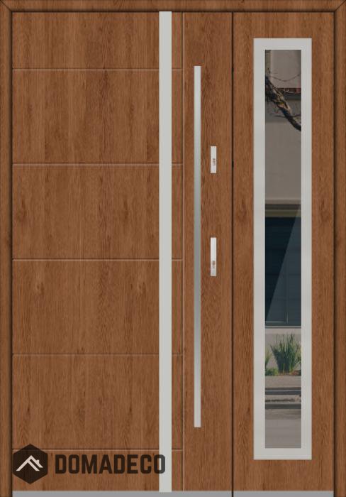 The door is made of stainless steel. Inside it is filled with PUR polyurethane foam and wood. The thickness of the door slab is 2.1 inch. Dual sealing system - one seal is in the dap of the frame and the other is located in the supporting part of the door slab. They reduce vibration and protect your house from losing the heat. They don't change their volume under the influence of atmospheric conditions. The door frame has anti-burglar reinforcements in hinge parts and locking points.