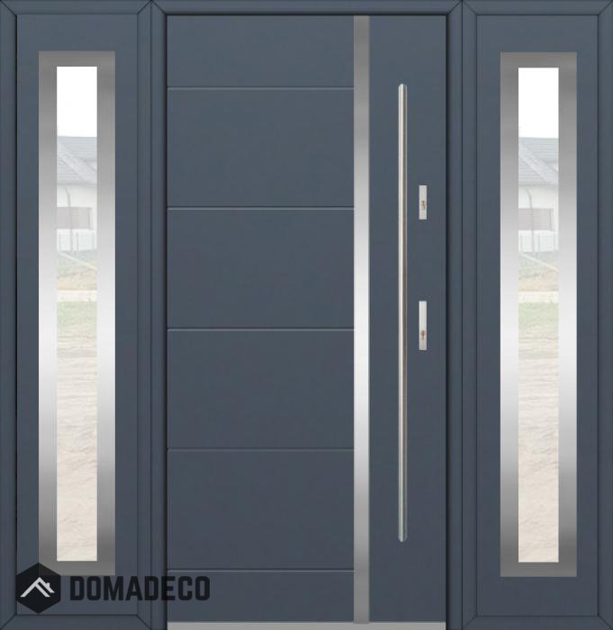 The door is made of stainless steel. Inside it is filled with PUR polyurethane foam and wood. The thickness of the door slab is 2.1 inch. Dual sealing system - one seal is in the dap of the frame and the other is located in the supporting part of the door slab. They reduce vibration and protect your house from losing the heat. They don't change their volume under the influence of atmospheric conditions. The door frame has anti-burglar reinforcements in hinge parts and locking points.