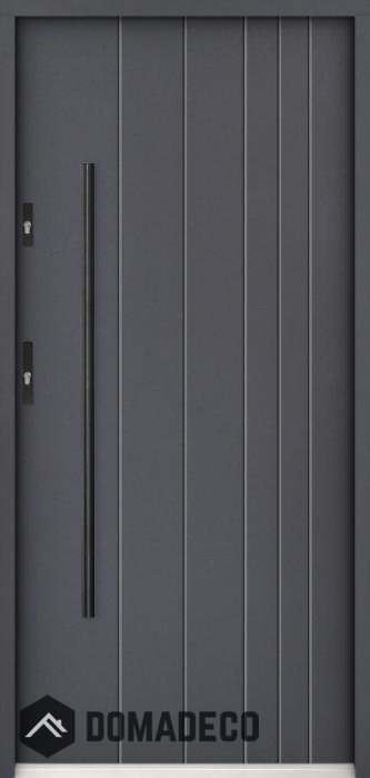 The door is made of stainless steel. Inside it is filled with PUR polyurethane foam and wood. The thickness of the door slab is 2.2 inch. Dual sealing system - one seal is in the dap of the frame and the other is located in the supporting part of the door slab. They reduce vibration and protect your house from losing the heat. They don't change their volume under the influence of atmospheric conditions. The door frame has anti-burglar reinforcements in hinge parts and locking points.