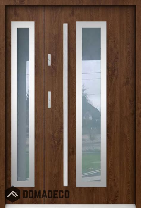 The door is made of stainless steel. Inside it is filled with PUR polyurethane foam and wood. The thickness of the door slab is 2.2 inch. Dual sealing system - one seal is in the dap of the frame and the other is located in the supporting part of the door slab. They reduce vibration and protect your house from losing the heat. They don't change their volume under the influence of atmospheric conditions. The door frame has anti-burglar reinforcements in hinge parts and locking points.
