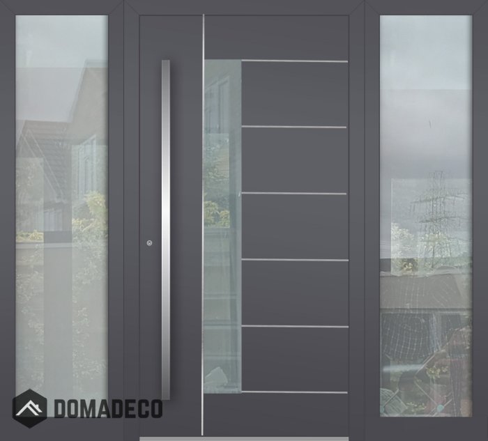 Aluminum LIM hinged front door with left and right sidelight