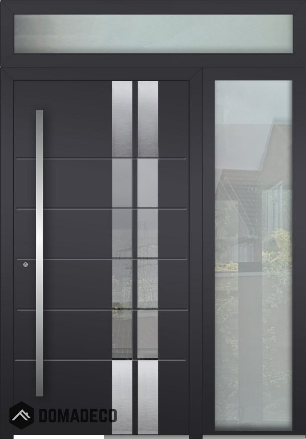 Aluminum LIM hinged door with right and top glass panel (view from the outside)