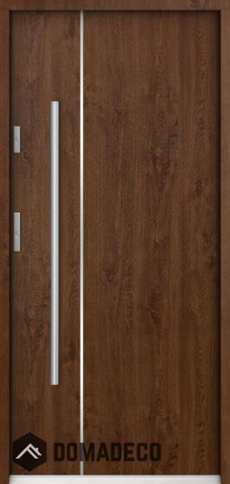 The door is made of stainless steel. Inside it is filled with PUR polyurethane foam and wood. The thickness of the door slab is 2.2 inch. Dual sealing system - one seal is in the dap of the frame and the other is located in the supporting part of the door slab. They reduce vibration and protect your house from losing the heat. They don't change their volume under the influence of atmospheric conditions. The door frame has anti-burglar reinforcements in hinge parts and locking points.
