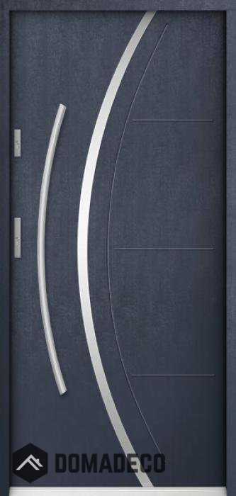 The door is made of stainless steel. Inside it is filled with PUR polyurethane foam and wood. The thickness of the door slab is 2.2 inch. Dual sealing system - one seal is in the dap of the frame and the other is located in the supporting part of the door slab. They reduce vibration and protect your house from losing the heat. They don't change their volume under the influence of atmospheric conditions. The door frame has anti-burglar reinforcements in hinge parts and locking points.