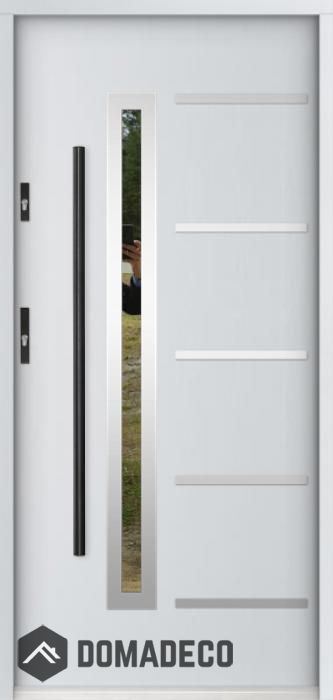 The door is made of stainless steel. Inside it is filled with PUR polyurethane foam and wood. The thickness of the door slab is 2.2 inch. Dual sealing system - one seal is in the dap of the frame and the other is located in the supporting part of the door slab. They reduce vibration and protect your house from losing the heat. They don't change their volume under the influence of atmospheric conditions. The door frame has anti-burglar reinforcements in hinge parts and locking points.