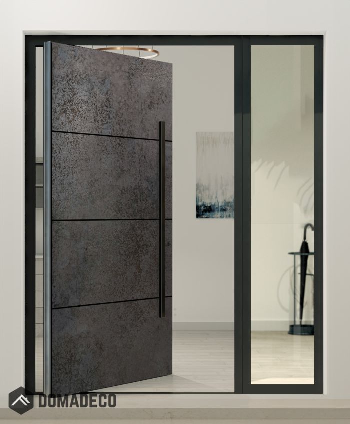 Aluminum Pivot door with right sidelight, glass panel (view from the outside)