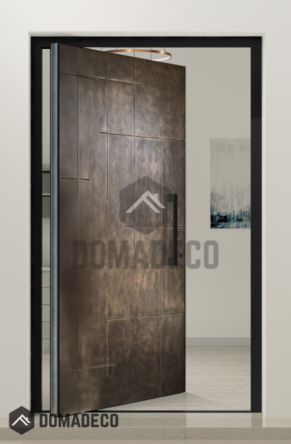 This pivot door is are covered with liquid metal. Liquid metal is a natural and ecological material that offers limitless design possibilities. Its combination of powdered metal and resins creates a durable and visually striking end result. With skilled craftsmanship and the use of modern application techniques, liquid metal can transform any space into a work of art while being mindful of the environment.