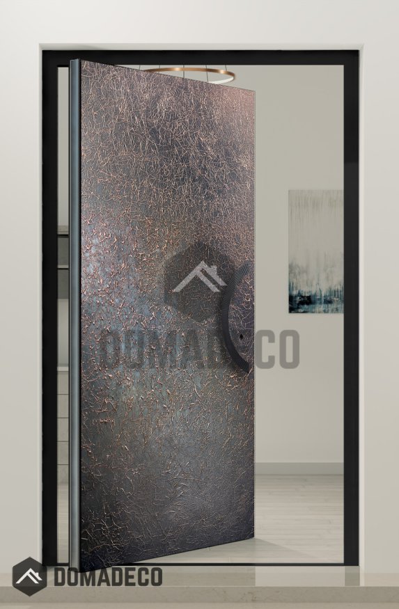 This pivot door is are covered with liquid metal. Liquid metal is a natural and ecological material that offers limitless design possibilities. Its combination of powdered metal and resins creates a durable and visually striking end result. With skilled craftsmanship and the use of modern application techniques, liquid metal can transform any space into a work of art while being mindful of the environment.