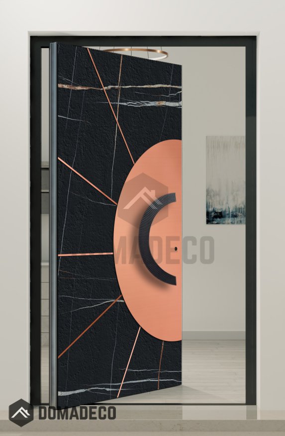 PIVOT Sahara - aluminum pivot door covered with Sahara Noir sintered quartz and copper sheet