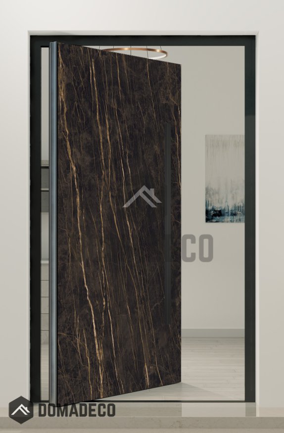 PIVOT V54 - aluminium pivot door covered with Noir Desir sintered quartz