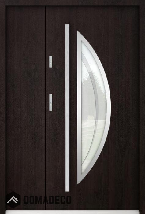 The door is made of stainless steel. Inside it is filled with PUR polyurethane foam and wood. The thickness of the door slab is 2.2 inch. Dual sealing system - one seal is in the dap of the frame and the other is located in the supporting part of the door slab. They reduce vibration and protect your house from losing the heat. They don't change their volume under the influence of atmospheric conditions. The door frame has anti-burglar reinforcements in hinge parts and locking points.